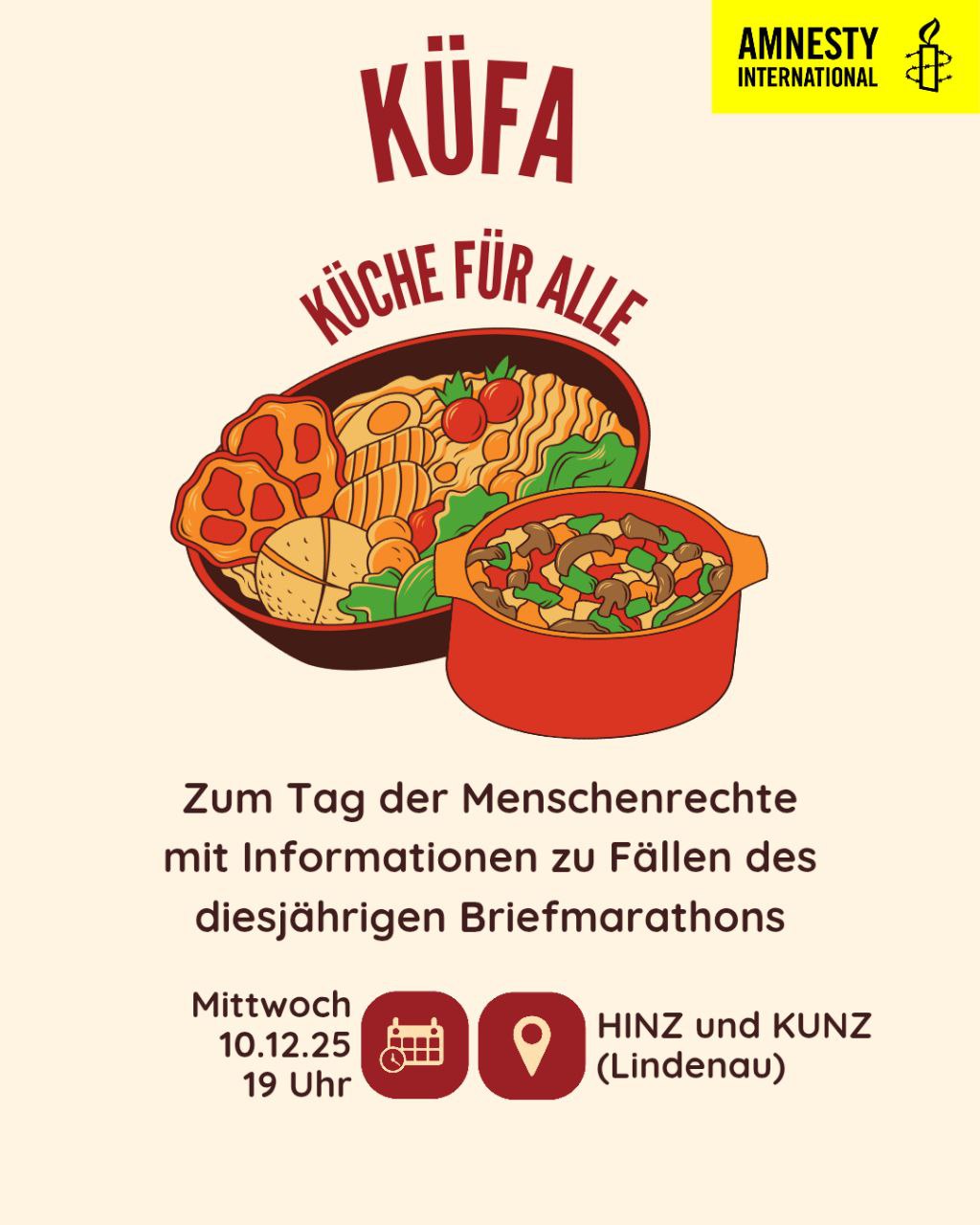 Wir von Amnesty Leipzig laden euch dazu zu einer KüfA im hinZundkunZ ein, um den jährlichen Briefmarathon vorzustellen, uns gemeinsam für die Menschenrechte einzusetzen, zu diskutieren und selbstverständlich gut zu essen.